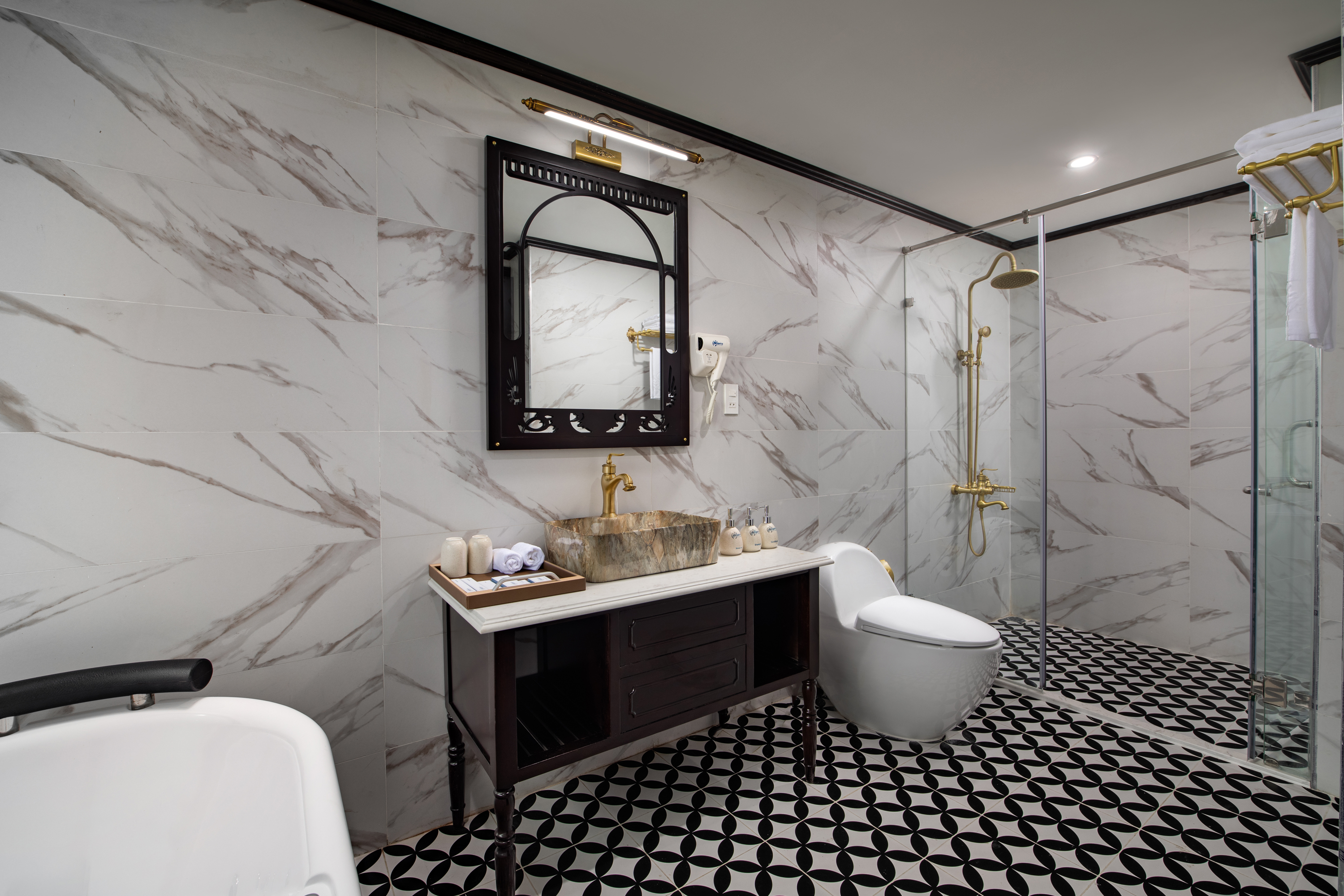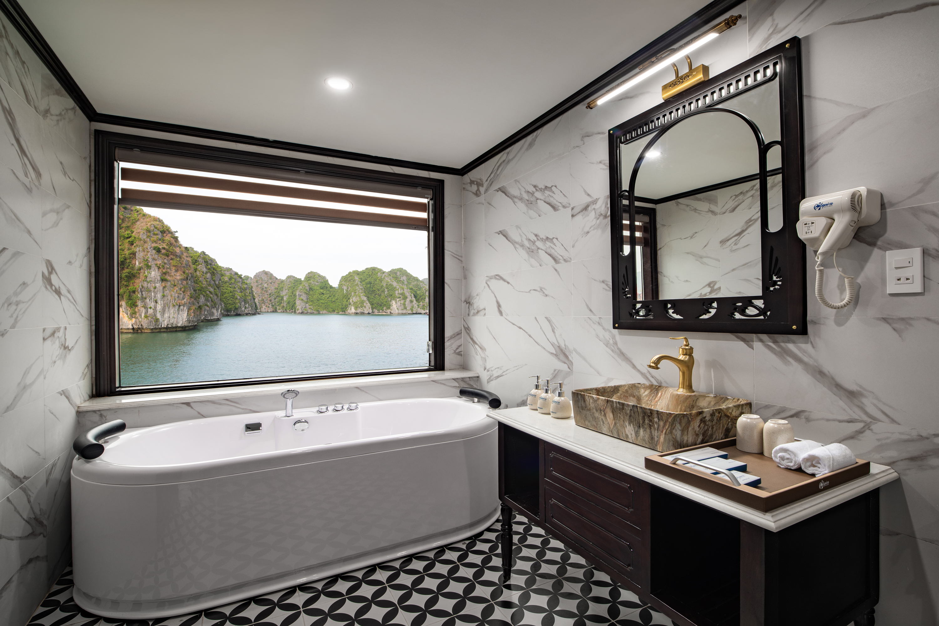 Services included • Welcome drink with warm/cold tissue • Entrance and sightseeing fees • Accommodation in a JUNIOR SUITE with private bathroom, air-conditioned, for 2 people • In-house English speaking guide • All meals • Fresh flowers throughout the ship • Sunset bar tea • All activities listed above, including swimming, kayaking, cooking and night squid fishing. • A bottle of wine is included when you stay in a PRESIDENT SUITE Services excluded • Transfers to and from Halong Bay • Visa arrangements • Spa and beauty services • Other drinks, tips and personal expenses • All other services not clearly mentioned • VAT