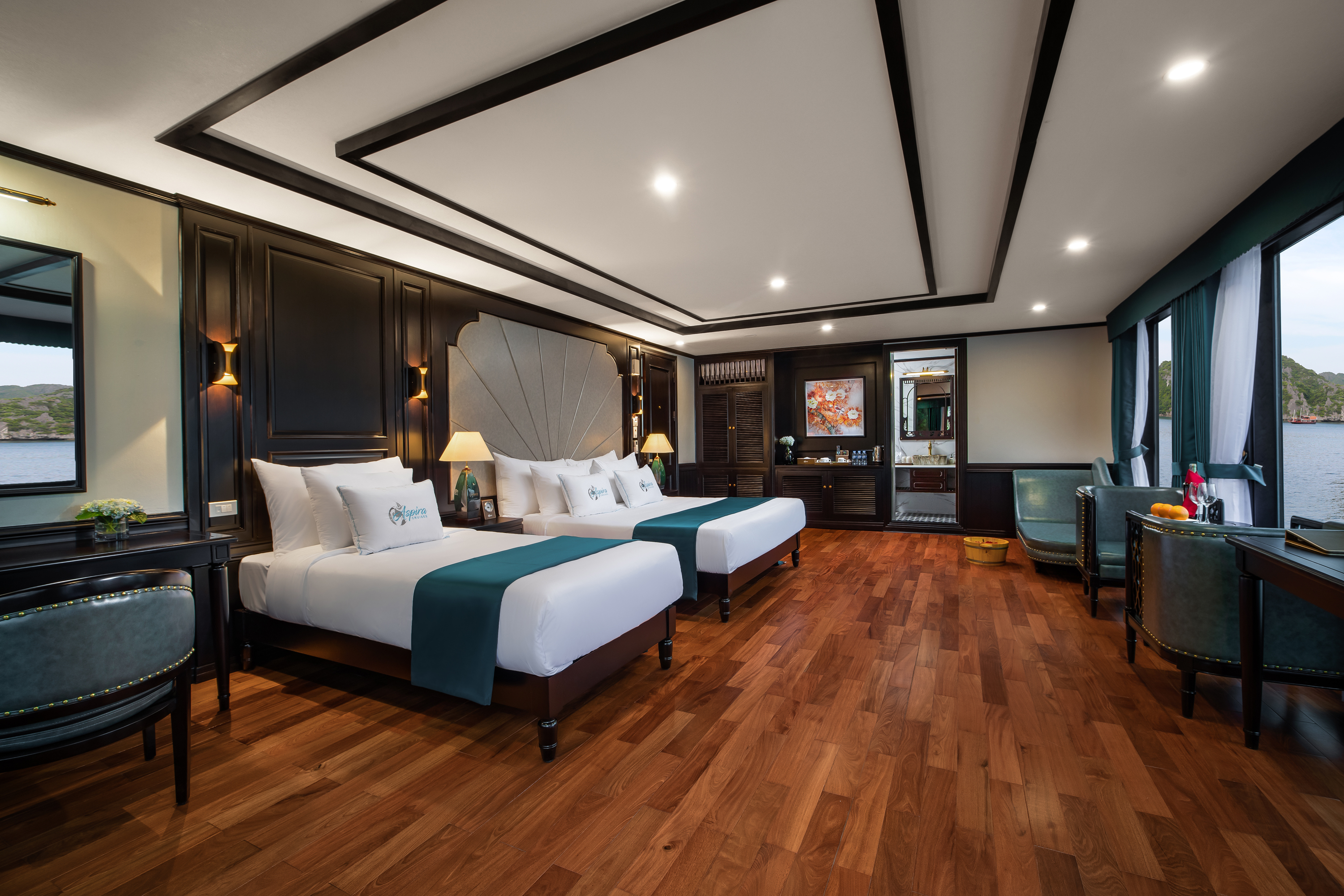 Aspira Cruises pleases every traveler with 5-star facilities and services on board according to international standards. You will have wonderful travel experiences, relaxing with a heart-shaped swimming pool, spa & massage room, gym and Jacuzzi. In addition, visitors can enjoy delicious meals at the luxurious restaurant & bar with panoramic views of Ha Long Bay.