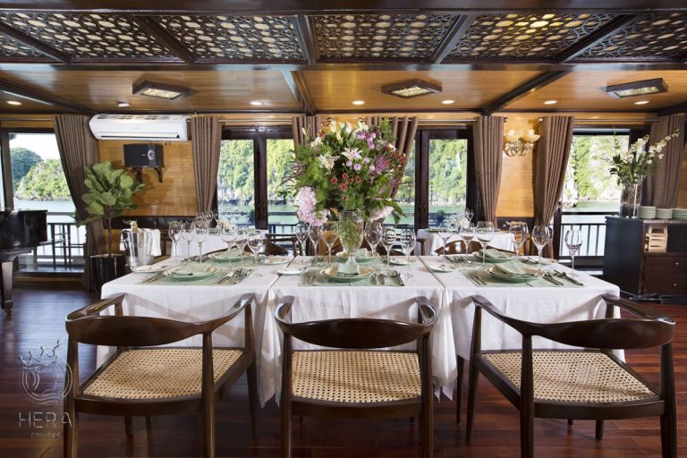 11:30-12:00 Khi đến số 12, Bến du thuyền Tuần Châu, quý khách sẽ được nhân viên du thuyền của chúng tôi chào đón nồng nhiệt tại phòng chờ và hoàn tất thủ tục nhận phòng. 12:00 Khi lên Du thuyền hạng sang Hera Grand, thủy thủ đoàn của chúng tôi sẽ chào đón quý khách bằng đồ uống giải khát và khăn lạnh trước khi nhận phòng. Tàu rời bến Tuần Châu, đưa bạn vào hành trình thú vị khám phá vẻ đẹp của Vịnh Hạ Long. Trên đường đi, bạn có thể ngắm nhìn một số địa điểm đẹp nhất ở Hạ Long và chiêm ngưỡng vẻ đẹp hùng vĩ của Vịnh với hàng ngàn hòn đảo đá vôi trong khi tàu hướng đến Hang Luồn và Đảo Titop. Thưởng thức bữa trưa tại nhà hàng sang trọng của chúng tôi trên tàu trong khi tàu di chuyển về phía Hang Luồn và Đảo Titop. 14:30: Trở về phòng và chuẩn bị cho các hoạt động bơi lội tại Đảo Titop. Tham quan Đảo Titop và đi bộ lên đỉnh để ngắm cảnh Vịnh Hạ Long tuyệt đẹp hoặc bơi lội vui vẻ trong làn nước trong xanh. 16:00: Du thuyền Hera sẽ đưa bạn đến khu vực Hang Luồn, bạn sẽ tham gia chèo thuyền kayak hoặc chèo bè quanh các khối đá nghìn năm tuổi. 17:30-18:00 Trở lại tàu, bạn sẽ tham gia tiệc hoàng hôn và lớp học nấu ăn trong khi tàu di chuyển về phía bờ. Bạn có thể tận hưởng những khoảnh khắc thư giãn khi nhâm nhi tách trà hoặc cà phê truyền thống Việt Nam trên boong tắm nắng giữa khung cảnh tuyệt đẹp và hoàng hôn tuyệt đẹp. Vịnh Hạ Long yên bình vào ban ngày, nhưng khi mặt trời lặn, Vịnh trở nên yên tĩnh và thanh bình hơn nữa. Bạn sẽ được đầu bếp của chúng tôi hướng dẫn làm bánh trôi truyền thống Việt Nam thơm ngon và sau đó thưởng thức bánh trôi do chính bạn làm. 17.30-18.30 Giờ khuyến mãi – MUA 2 ĐỒ UỐNG TẶNG 1 ĐỒ UỐNG 19.30 Ăn tối ngoài trời. Thưởng thức bữa tối lãng mạn ngoài trời (nếu thời tiết thuận lợi) hoặc Nhà hàng 21.30 Sau bữa tối, bạn sẽ được ngắm nhìn quang cảnh yên bình của Vịnh vào ban đêm trên boong tàu. Bạn cũng có thể tham gia các hoạt động buổi tối như mát-xa (có tính phí), ngâm chân thảo dược trong phòng (miễn phí), trình diễn trang phục truyền thống “Dấu chân di sản” và một số đồ uống tại Sky Bar trong khi chiêm ngưỡng quang cảnh ngoạn mục của Vịnh vào ban đêm và câu mực. Du thuyền neo đậu để bạn có một đêm nghỉ ngơi yên bình tại khu vực yên tĩnh