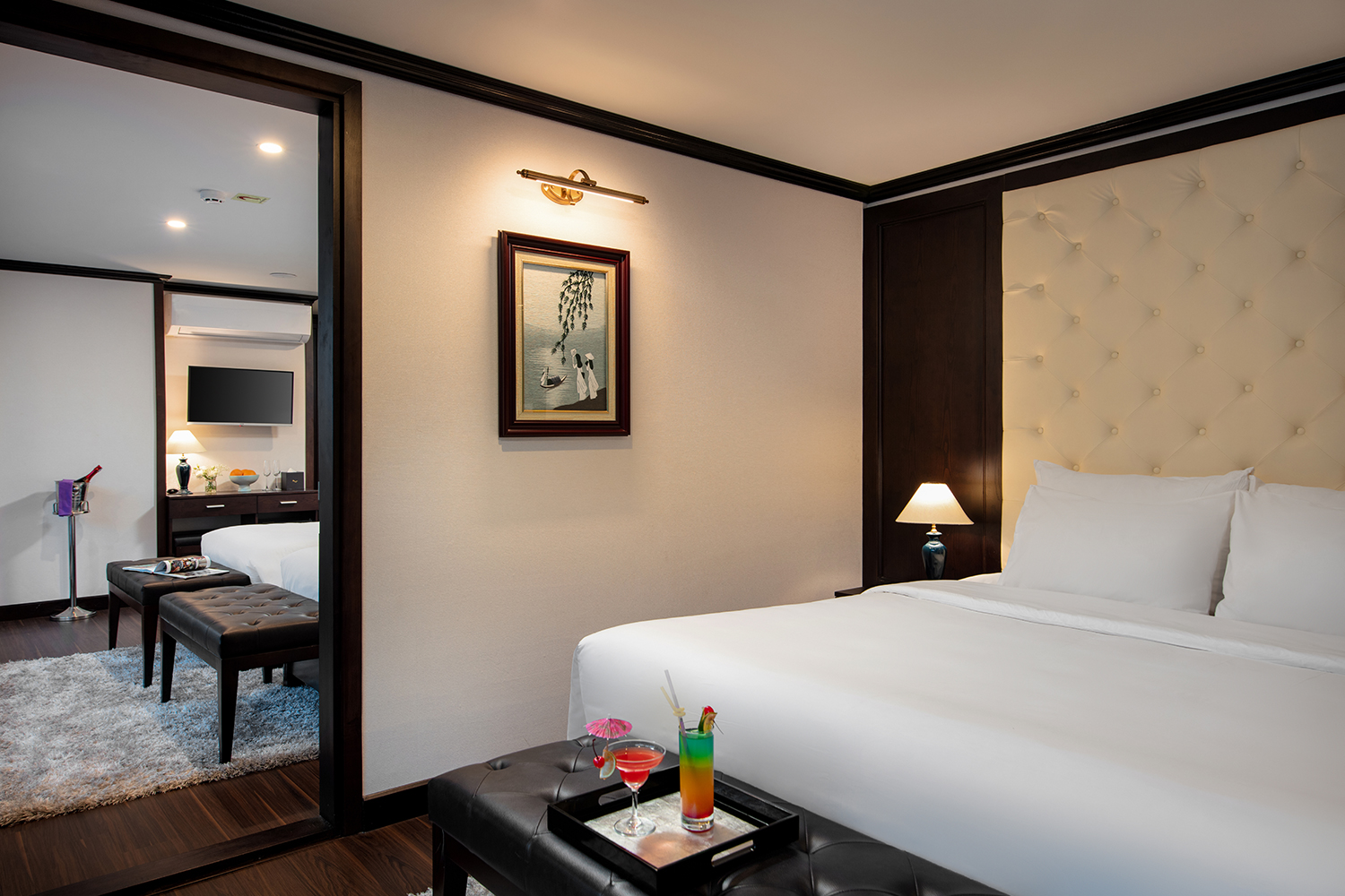 • Các tiện nghi sang trọng, Phòng ngủ tiện nghi và điều hòa, 1 Chai nước 0,5l/ngày/khách.