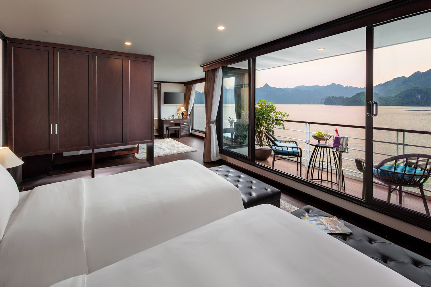 Mang vẻ ngoài trắng tinh khôi, thanh lịch và nội thất sang trọng, Âu Cơ sở hữu 32 cabin tinh tế với ban công riêng hướng biển. Đây không chỉ là một chiếc tàu, mà là một "resort nổi" giúp du khách thư giãn tối đa.