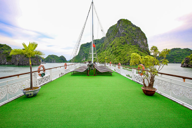 06.30 Chào đón một ngày mới với bình minh tuyệt đẹp trên Vịnh Bắc Bộ huyền thoại. Làm mới cơ thể và tâm hồn của bạn bằng bài học Thái cực quyền trên boong tắm nắng 07.00 – 08.00 Ngắm cảnh biển buổi sáng với một tách trà hoặc cà phê, ăn sáng trong khi say mê mê cung Karst. 8:00 – 9:00 Tham gia hướng dẫn khám phá những phần ẩn giấu của vịnh, hang Luồn. Bạn chia sẻ một chiếc thuyền tam bản với những du khách khác với một người chèo thuyền địa phương hoặc tự chèo thuyền kayak.