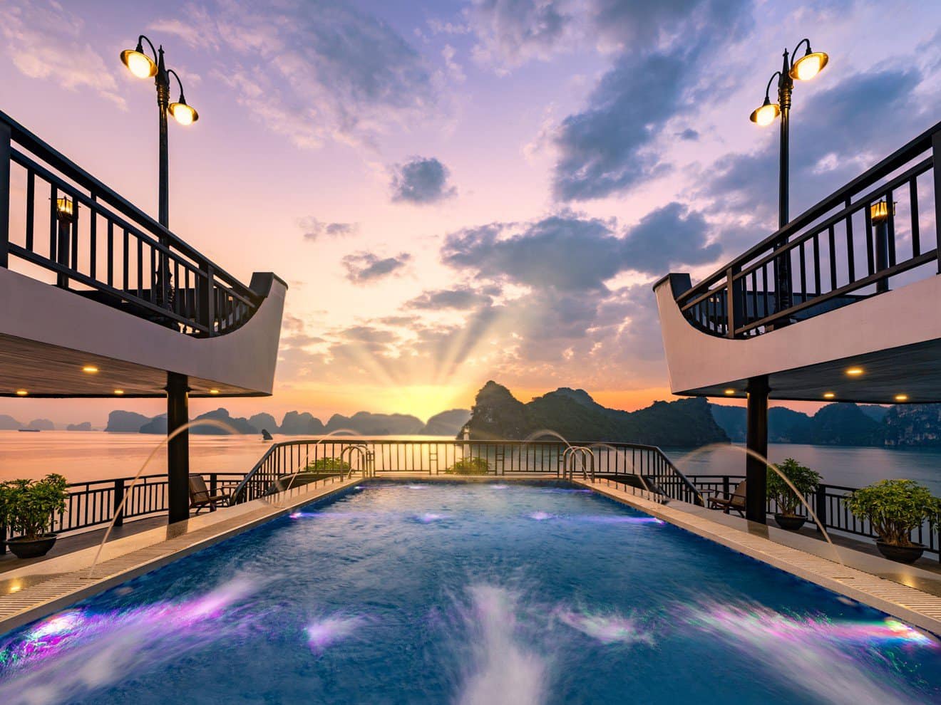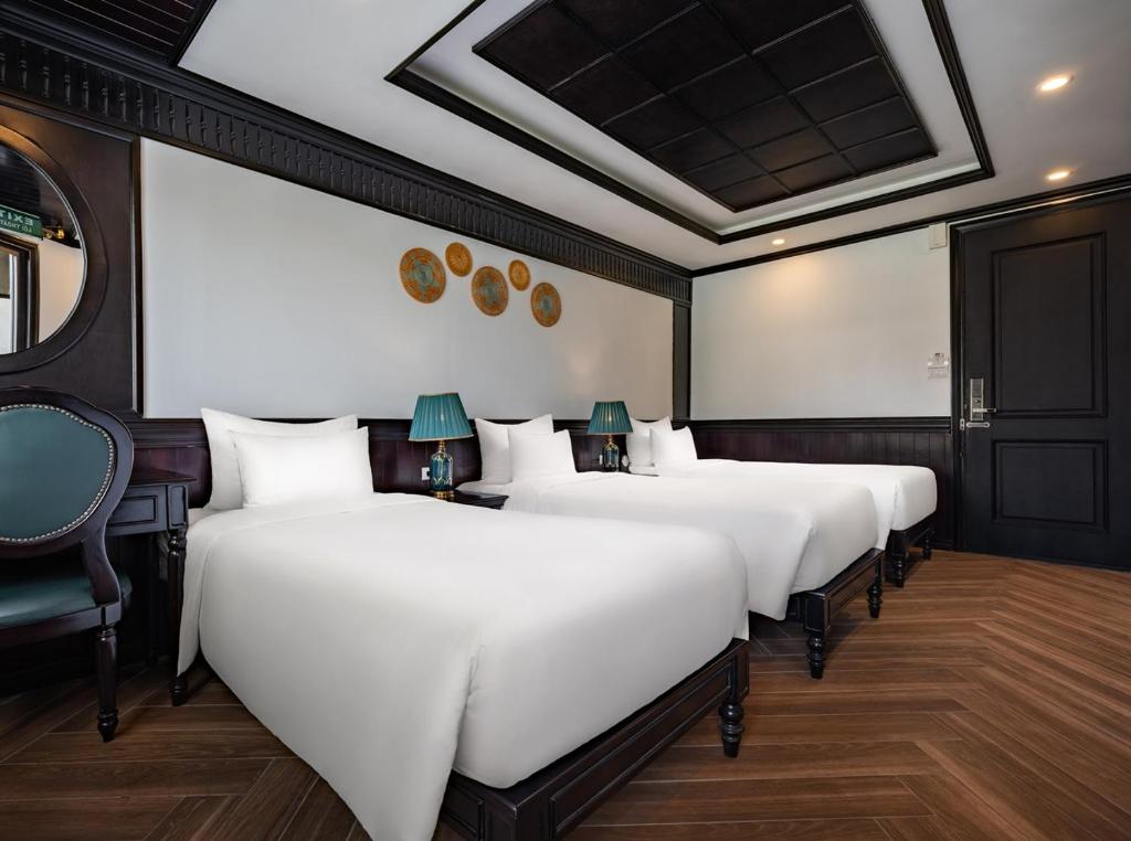 Phòng nghỉ: Phòng cabin sang trọng, có phòng tắm riêng. Bữa ăn: Tất cả các bữa ăn trên tàu (02 Bữa trưa, 01 Bữa tối, 01 Bữa sáng). Hoạt động: Chèo Kayak và đi thuyền nan địa phương. Trải nghiệm: Lớp học Nấu ăn trên du thuyền và dụng cụ Câu Mực. Chi phí: Phí tham quan, vé thắng cảnh. Nhân sự: Hướng dẫn viên nói tiếng Anh. Tiện ích: Đồ uống chào mừng, Wifi trong phòng, TV LED HD vệ tinh, và bảo hiểm trên tàu.