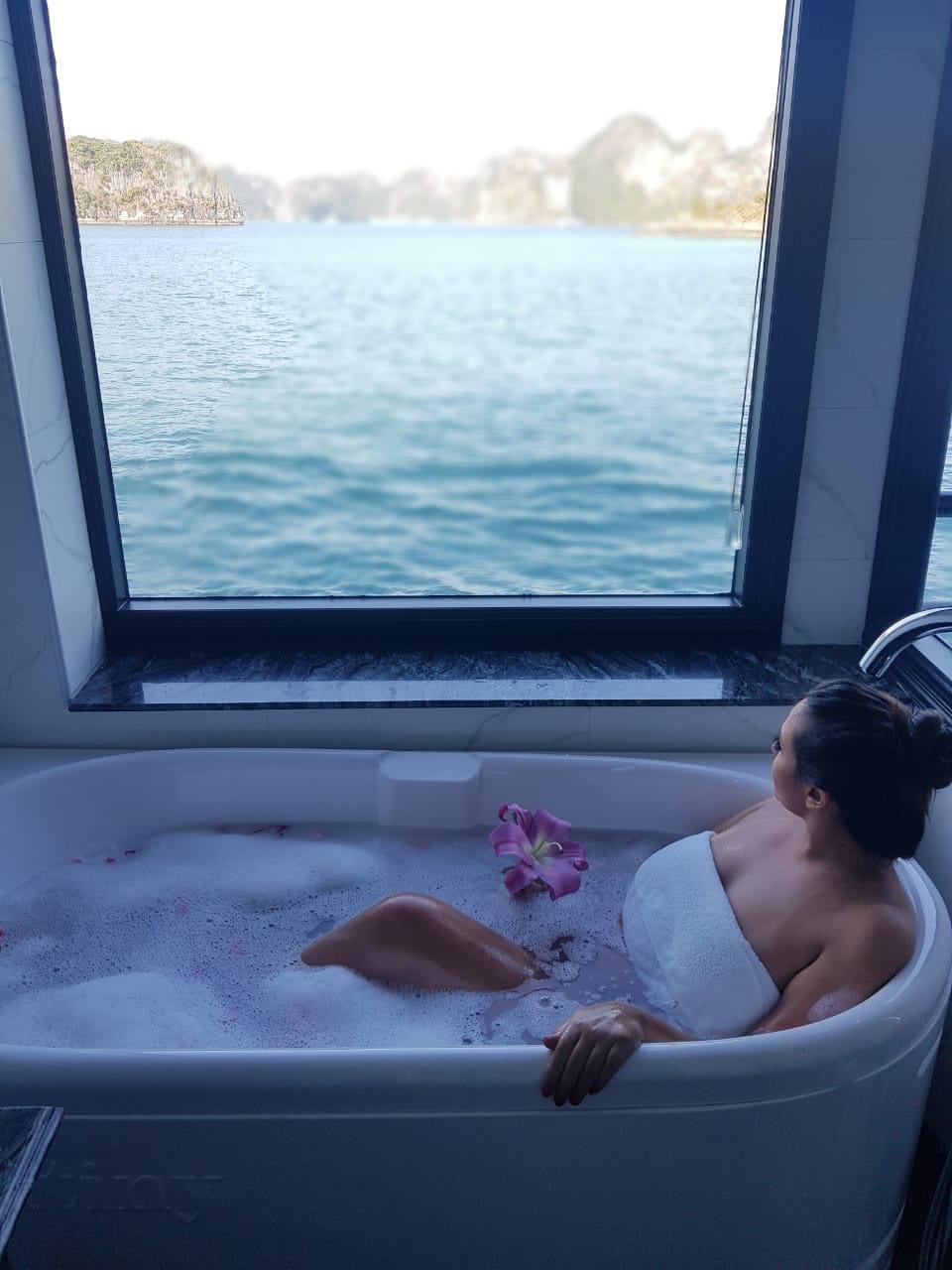 11:30 – 11:45 Quý khách có mặt tại ô số 26 bến Cảng tàu quốc tế Tuần Châu. Lễ tân nhà chờ Rosycruise sẽ đón tiếp và đưa Quý khách lên tàu chuyển tải di chuyển tới du thuyền Rosycruise ngủ đêm trên vịnh Lan Hạ. 12:15 – 12:45 Quý khách lên du thuyền và ghé thăm khu vực nhà hàng thưởng thức đồ uống chào mừng trong khi nghe giới thiệu ngắn gọn về lịch trình và hướng dẫn quy định an toàn trên tàu. 13:00 – 13:30 Quý khách thưởng thức bữa trưa tại nhà hàng trên tầng 4. 14:00 Quý khách làm thủ tục nhận phòng. 15:30 -17:00 Quý khách chèo kayak,chèo SUP, tự do bơi, tắm nắng, tắm biển hoặc ngâm mình tại bể sục bốn mùa. 17:30 Thưởng thức đồ ăn nhẹ ngắm hoàng hôn tại R’sky bar trên sundeck tầng 5. 19:00 Ăn tối Buffe sang trọng tại nhà hàng. 20:30 Thư giãn tự do