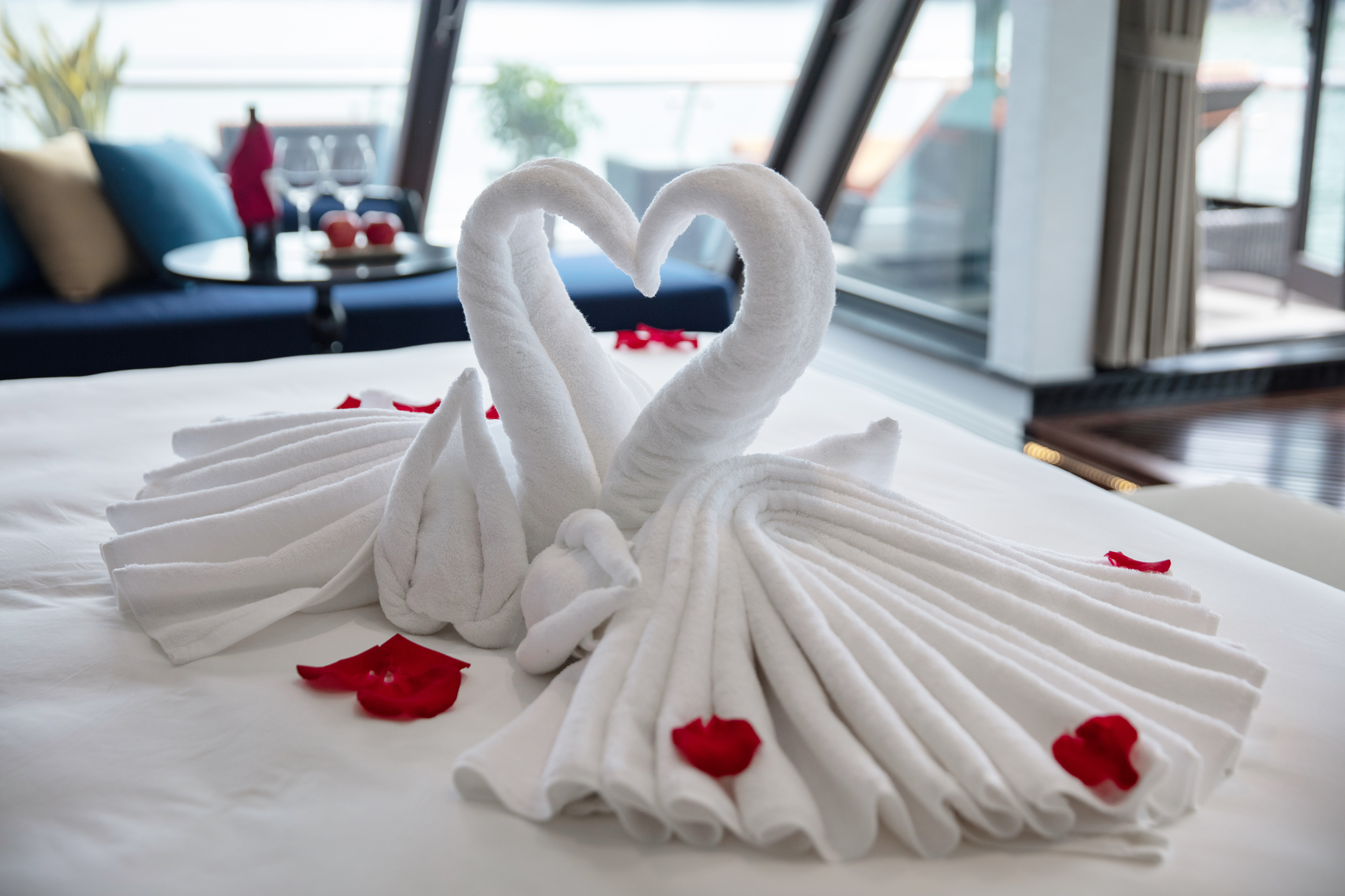 • Phòng nghỉ trên du thuyền sang trọng tiêu chuẩn 5 sao (có bồn tắm và ban công riêng) hạng Junior Suite.