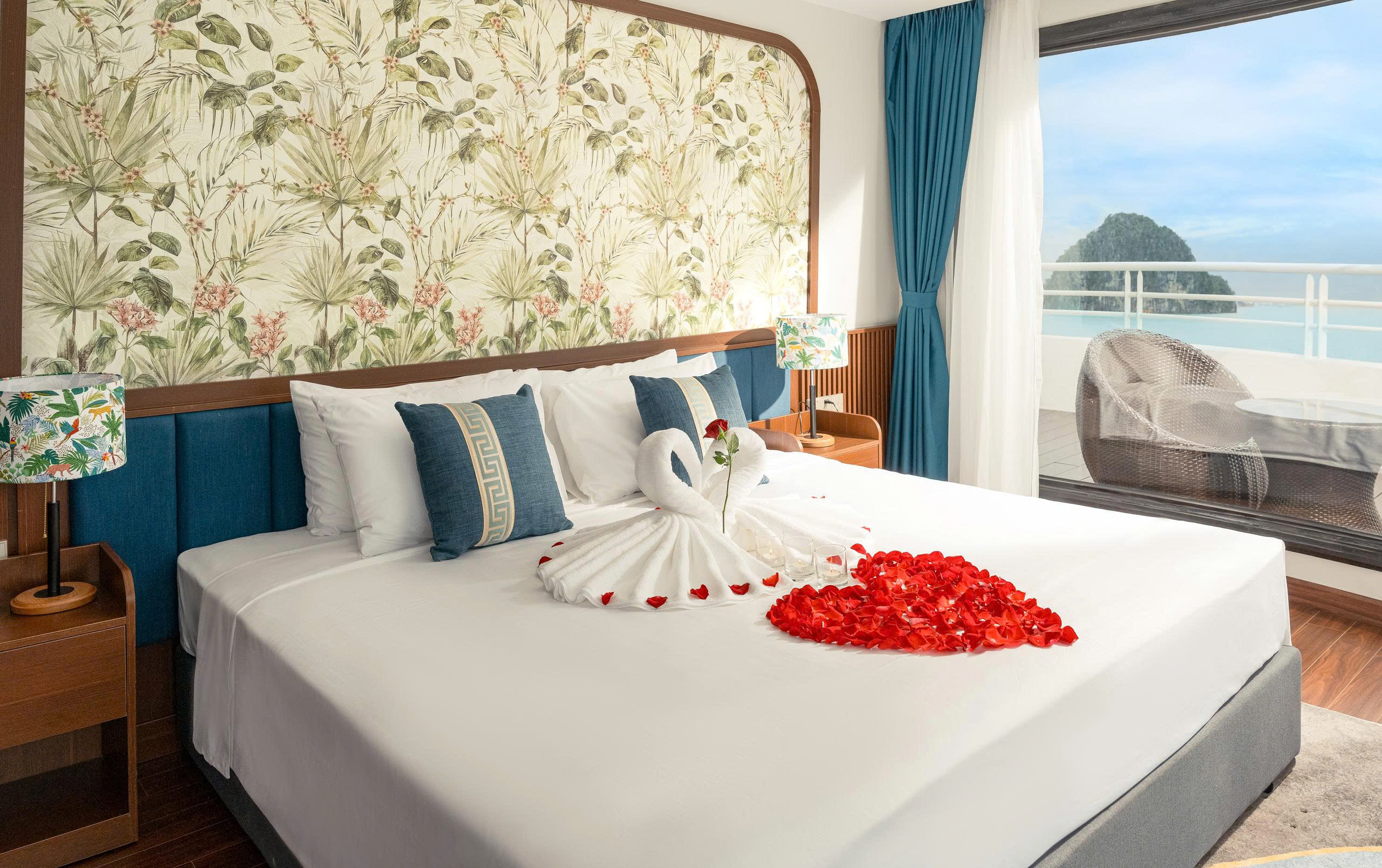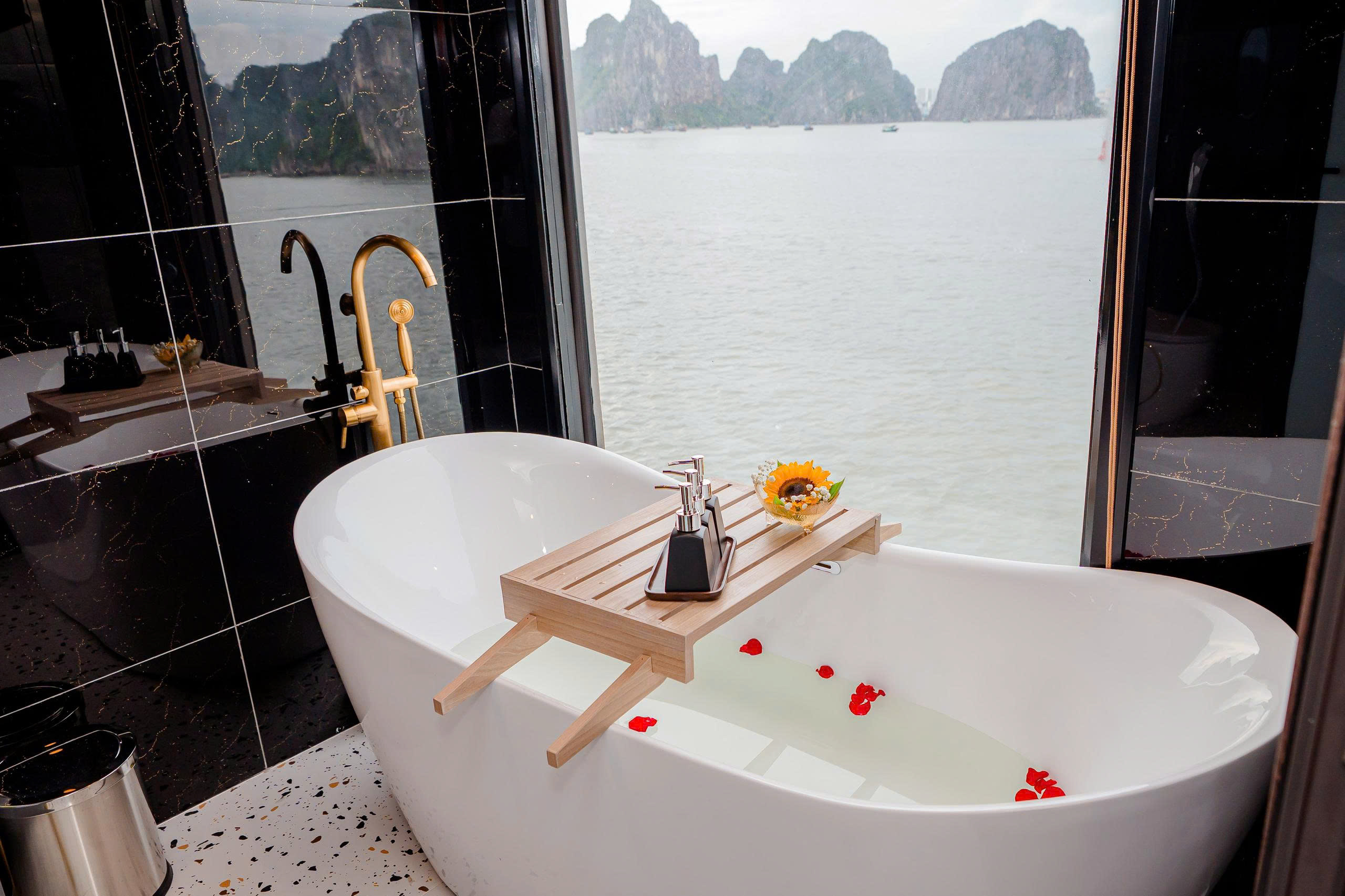 11:30 – 12:00: Guests gather for check-in at the waiting lounge, enjoy a refreshing drink, and listen to a short briefing. 12:15 – 12:30: Transfer to the cruise ship in Lan Ha Bay. Guests board, receive a welcome drink, listen to a safety briefing, and check into their cabin. 13:00: Enjoy Lunch while the cruise sails past areas like Elephant Leg Islet and Tra Bau Fishing Village. 15:30: The cruise arrives at the Dark & Bright Cave area. Guests can choose to kayak or take a bamboo boat ride, followed by swimming (weather permitting). 17:30: Return to the cruise to relax, admire the sunset, enjoy the “Happy Hour” promotion, and join a cooking class with the chef. 19:00: Indulge in a luxurious Set Menu Dinner. After dinner, guests are free to relax, enjoy squid fishing, or spa services (additional charges apply).