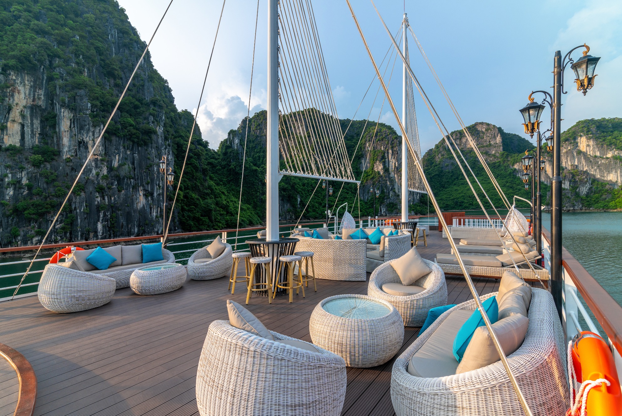 Enjoy sunset Canapé party and live music band on sundeck while cruising in a mid of magnificent beauty of Halong Bay or have a self-immersion in our relaxed four seasons Jacuzzi.