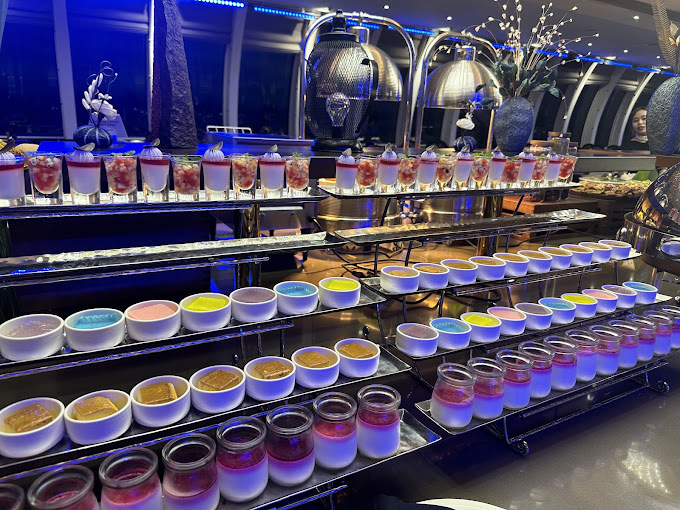 18:45 Thưởng thức tiệc buffet Á - Âu thịnh soạn hàng trăm món ăn với đặc sản Hạ Long và nhiều lựa chọn từ khắp nơi trên thế giới. (Enjoy a sumptuous Asian - European buffet with hundreds of dishes including Ha Long specialties and many choices from around the world.)