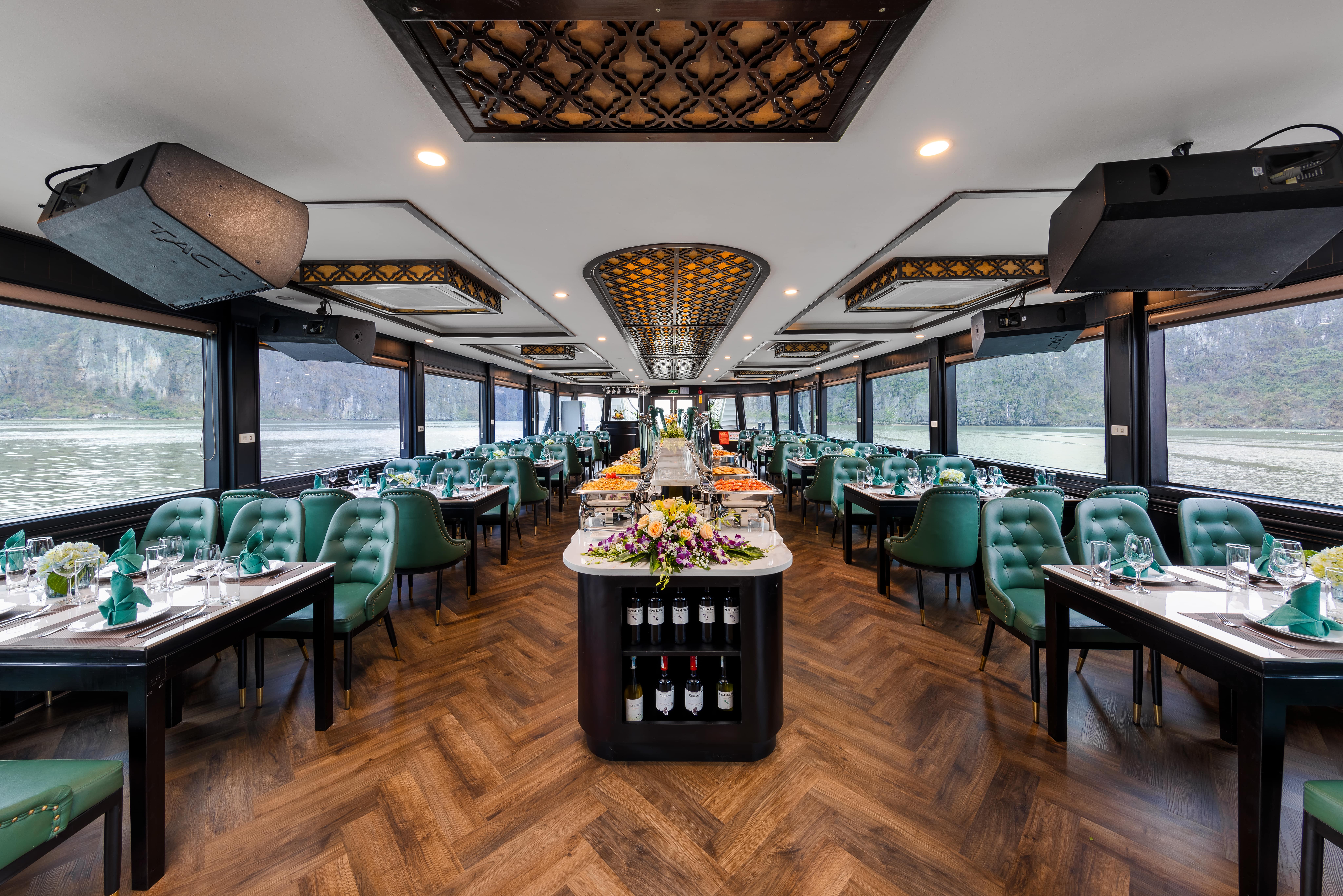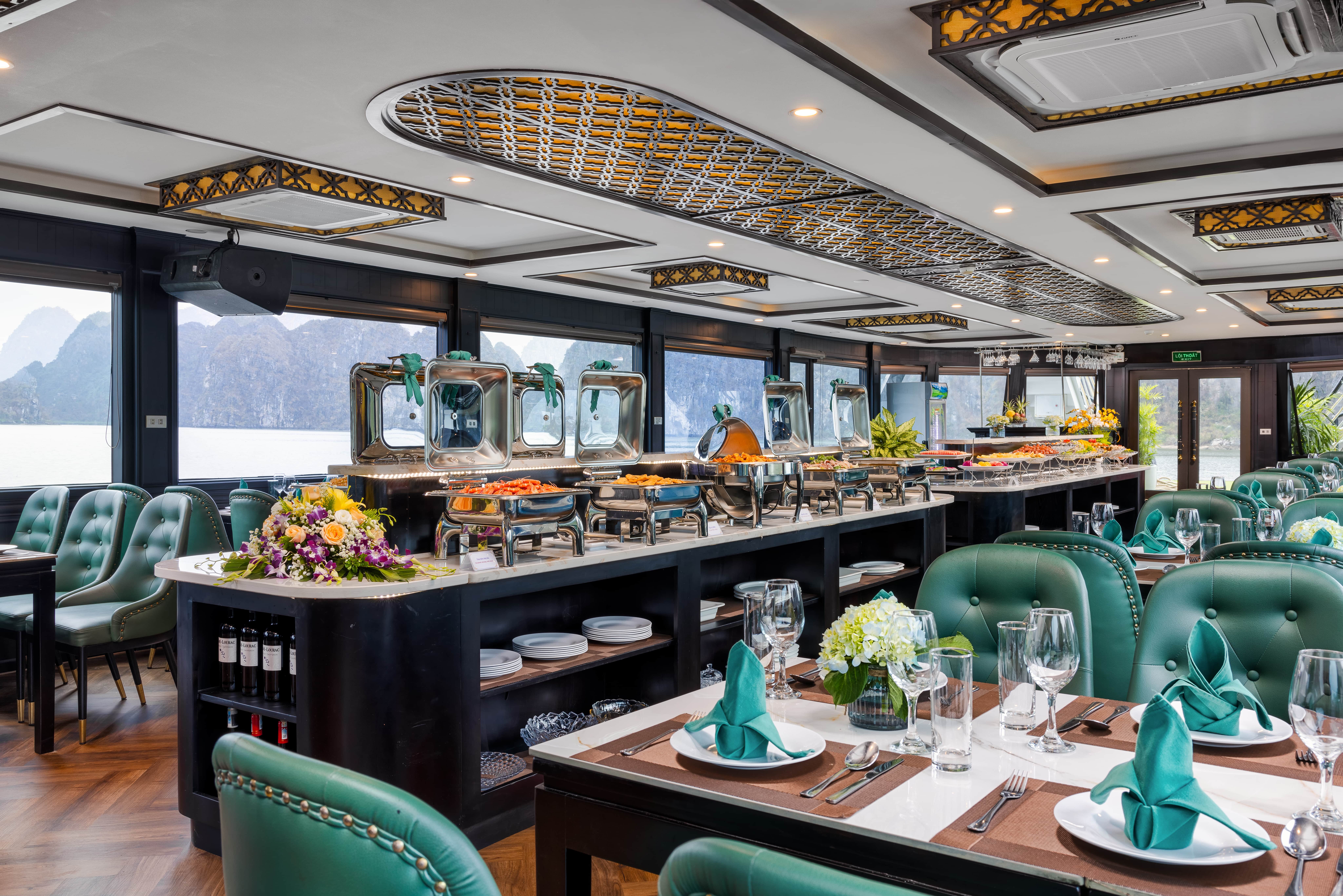 Qúy khách dùng bữa trưa buffet tại nhà hàng sang trọng trên tàu với thực đơn đa dạng các món ăn truyền thống, hải sản đặc sắc của vùng biển Hạ Long.