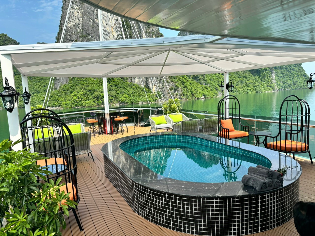 16:30: After that, you will get back to cruise and ready for our Sunset Party. Vietnamese tea, cakes, fresh fruits and snacks will be served when you’re relaxing on the sundeck or in the Jacuzzi.