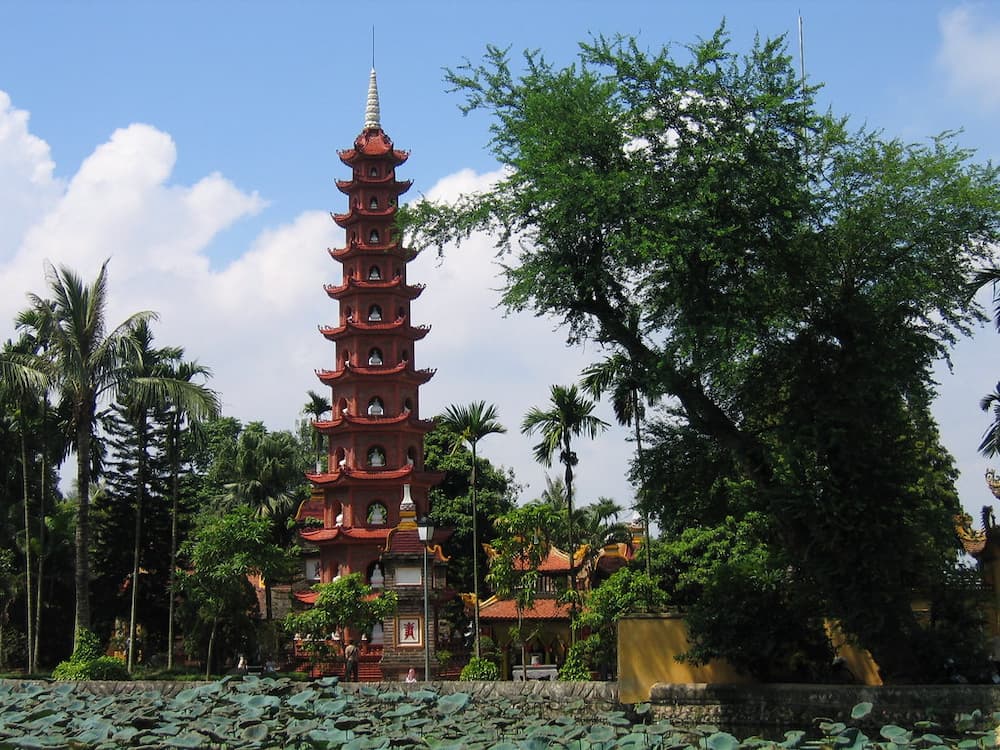 • Tran Quoc Pagoda located on an east side isle of the West Lake (Tay Ho district), It is considered as the most ancient pagoda in Thang Long - Ha Noi with its historical progression in 1500 years. It has a harmonious combination between the majesty, hoariness architecture and peaceful landscape of the West Lake. From the period in the Ly and Tran dynasties, it had become the Buddhist center of Thang Long.
