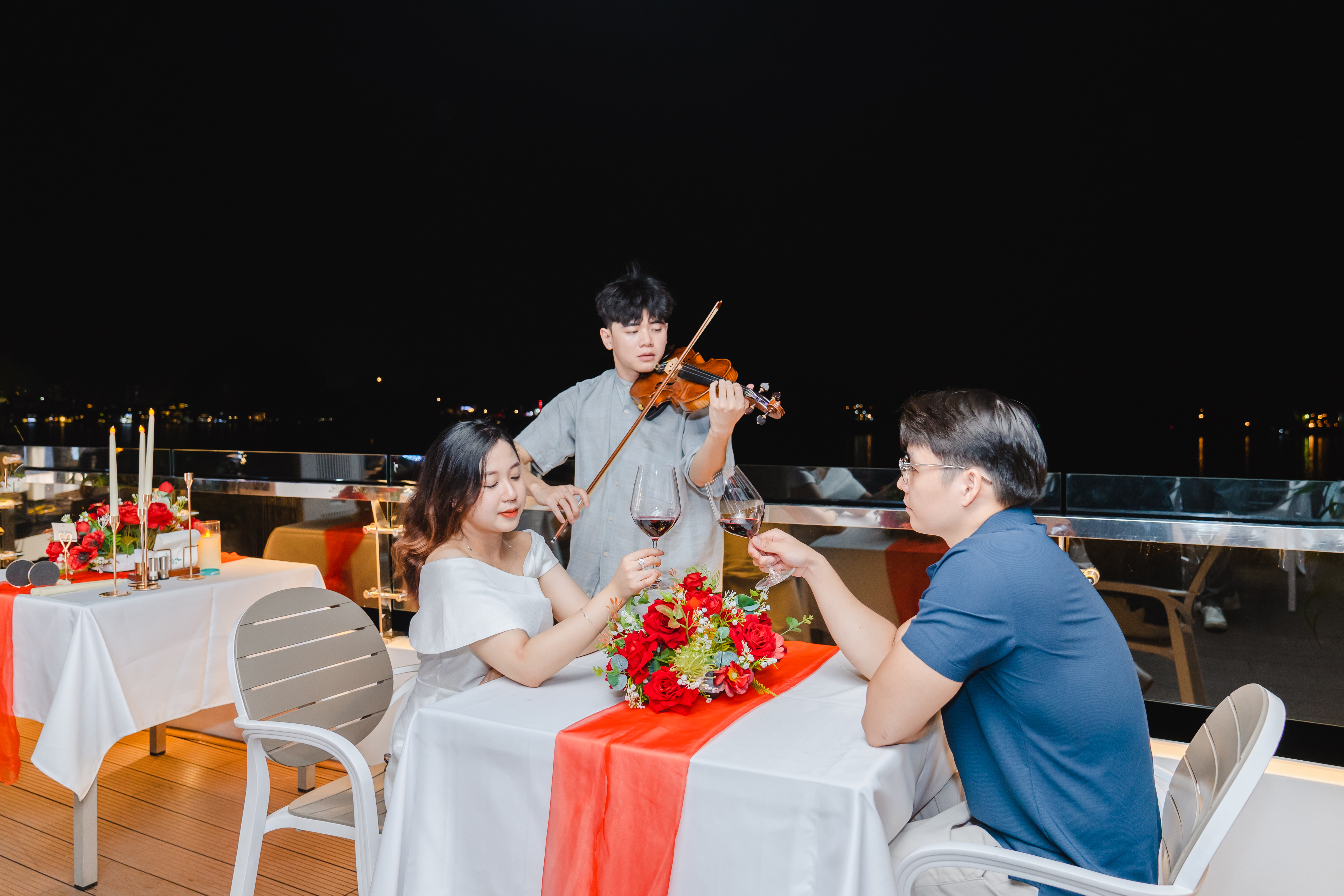 Quý khách sẽ thưởng thức bữa tối tinh tế với các món ăn độc đáo được chuẩn bị kỹ lưỡng bởi bếp trưởng Saquila và bày biện sáng tạo, khơi dậy mọi giác quan trong không gian lãng mạn, hòa quyện cùng âm thanh du dương trên Du thuyền.
